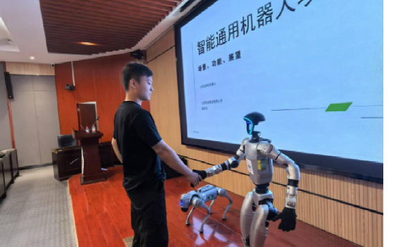 在同学们最期待的人机互动时刻,人形机器人与学生代表握手时,其仿生关节的灵活引发阵阵惊呼,机器狗稳健地迈着步伐在会场内走动跳跃,四足协同动作展现出其极高的灵活性。