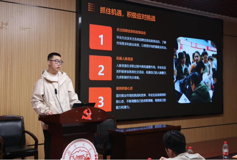 党委副书记刘明然、本科生辅导员叶胜参加本次指导会,活动邀请了往届和应届优秀就业典型代表进行分享,本科生辅导员迪里胡玛主持会议。