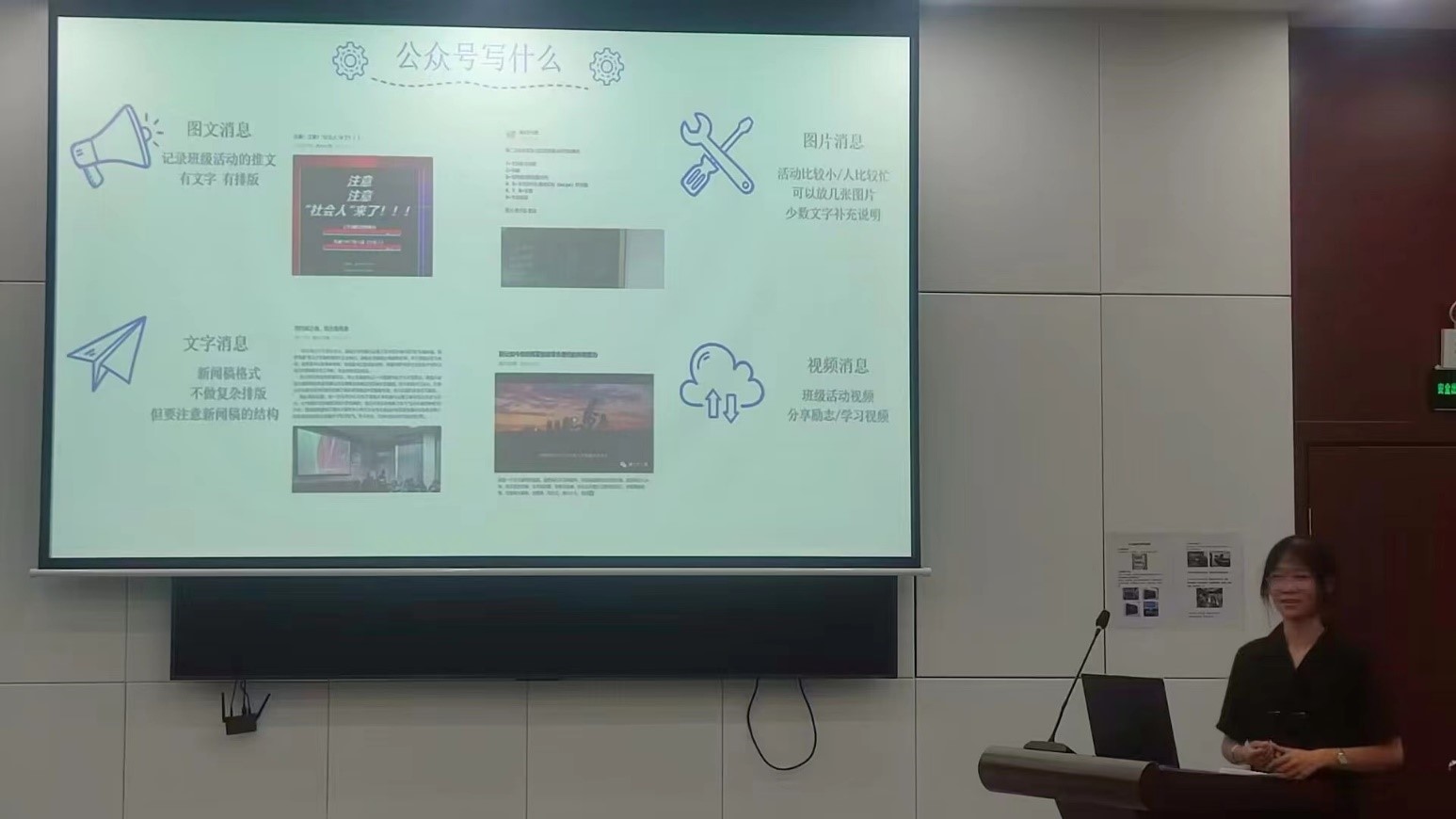 本次会议具体分为两项进程,首先由具有一周年工作经验的宣传委员康茹以PPT解说形式对新任宣委进行详细工作指导、经验分享以及疑难解惑,其内容紧扣公众号运营手法及新闻稿写作要求展开。而后由唐烨进行具体注意事项补充及近期重点工作内容安排。两位宣传委员虽然年隔一届,经验不同,但都不约而同地指出:新闻报道应当真实客观,尤其应当注重时效性和质量;工作方面应明确自身职责,提前为活动记录工作做准备,力求将严谨务实的工作作风贯彻到日常工作的一点一滴中,尽善尽美地将每一篇推文和稿件呈现到读者面前。