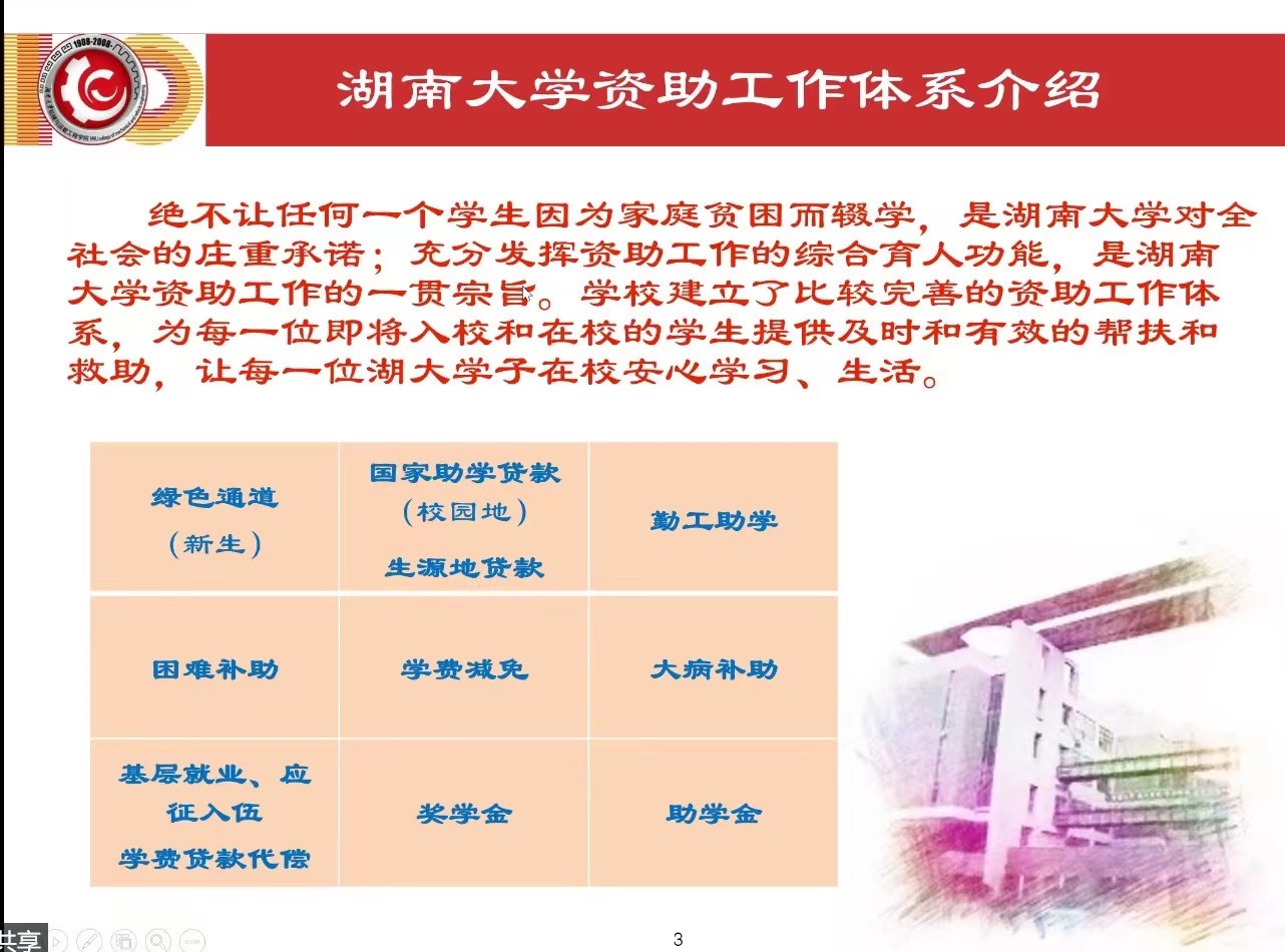 资助工作体系中的九类学生资助——绿色通道、生源地贷款、校园地贷款、勤工助学等。其次,李老师就两种助学贷款指出:我们更推荐大家申请生源地贷款,因为校园地贷款的时间在开学之后,学生在申请时可能会出现遗漏一些流程的事情。同时李老师提出相关人员在进行学生资助工作时应积极维护学生隐私,做好相关的工作。