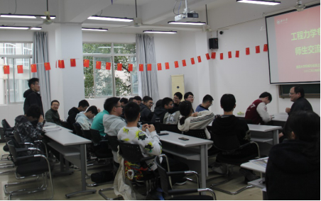 楼210教室热烈举行。力学系系主任方棋洪老师、支部书记任毅如老师、副主任赵岩老师、以及王晓刚老师、何巍老师、刘播老师、冯慧老师、林森老师、彭神佑老师、施方成老师等10余位老师和30余位同学参加该交流会。