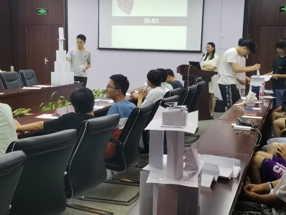 最后进入团队融合环节。新生助理们自由询问他人的信息,并在最后向大家一一介绍自己新认识的同学,通过这种特别的形式进行了自我介绍,现场的气氛变得活跃起来。接下来是考验团队默契的“搭塔”,各小组成员通过手势比划等非语言方式进行交流,用纸和胶带搭建一个纸塔,四个小组在短时间内各出奇招,用默契创作出了创意十足的作品。搭建完成后,各组都派出了一位代表对该组的作品的创作理念进行了解释说明。同学们通过观察发现每一组的作品很大程度上取决于“领头羊”的行为,后面的同学会仿照第一位同学纸的折法参与到纸塔的搭建中来,以小见大体现了团队领导者的重要性,这也与培训中提到的新生助理的意义和作用不谋而合。