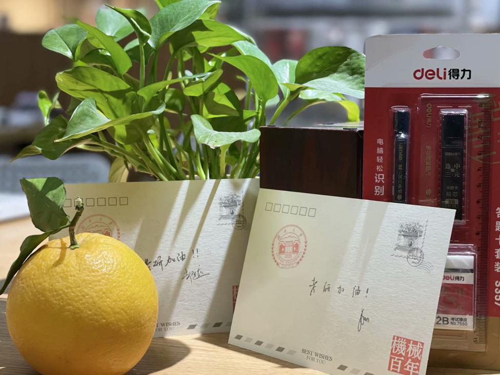 书记彭晓燕和院长姜潮亲笔写下的考研祝福,小小的明信片,承载着院领导和老师们亲切的关怀和真挚的慰问,预祝考研学子们金榜题名;一套文具则是希望同学们在倒计时一个月里调整好心态,劳逸结合,平稳度过最后的冲刺阶段,万事“具”备,势“笔”成功,以饱满的热情,放松的心情迎接即将到来的考试。
