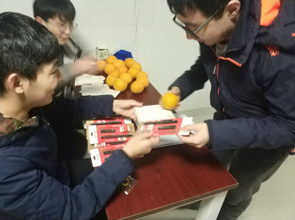 活动当晚,二百多位考研学子在晚上9:00至10:30陆续在天马一区二栋宿舍门口领取属于他们的暖心小礼物。每份礼品分别由一个脐橙、一张明信片和一套文具组成,硕大饱满的脐橙寓意考研“橙”功,祝福同学们前“橙”似锦;明信片是由jojo漫画