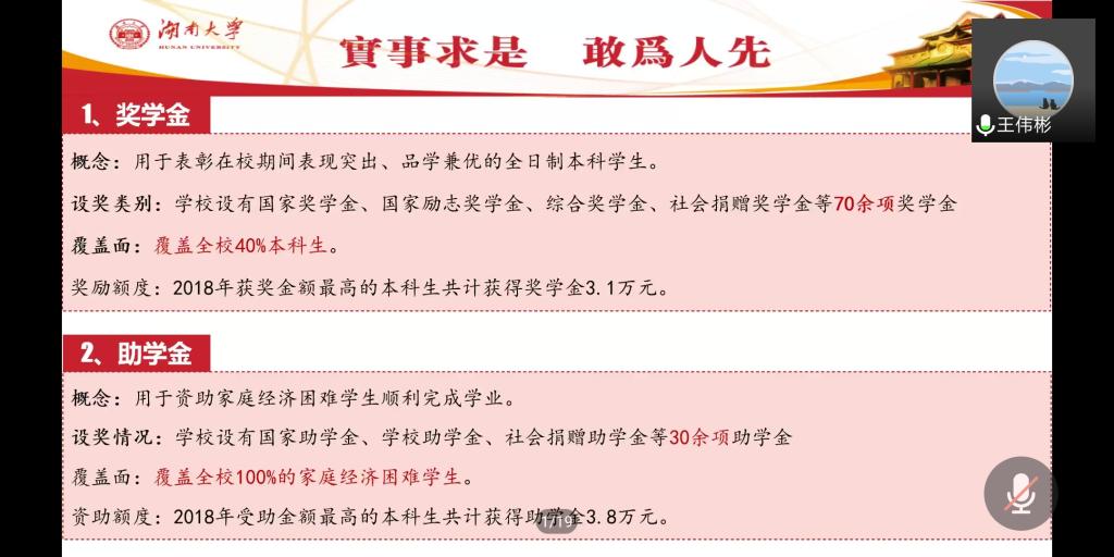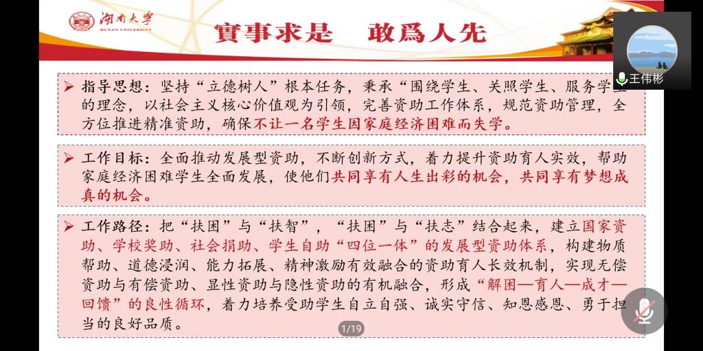 随后,在工作政策方面,王伟彬老师通过对奖学金、助学金、助学贷款、勤工助学、困难补助、学费减免、绿色通道、惠民工程和学费补偿九个方面的介绍,展示了湖大目前全覆盖的资助政策体系。除此之外,他还向参会人员简单展示了2019年学生奖助学金的大致情况,梳理了各项政策审核的重要时间节点。