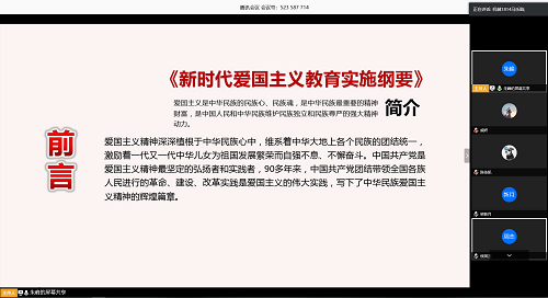 班委精心设计班会流程,四位同学率先领学,积极宣传疫情防控知识。班长朱峰带领大家学习领会习总书记关于疫情防控重要指示精神,团支书马乐晗宣讲《新时代爱国主义教育纲要》内容,增强同学们的必胜信心和爱国热情;心理委员安莊传递疫情期间身心健康理念和防控知识,安全委员孟想讲解《jojo漫画