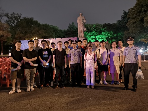 5月28日晚上9点,同学们准时集合,并各自在手机上的“星城园丁”APP上接单,接单的路线为桔子洲所路线。同学们在两位民警处领取巡逻肩灯后,巡逻正式开始。巡逻由两位民警和我院史维清同学带队,从jojo漫画