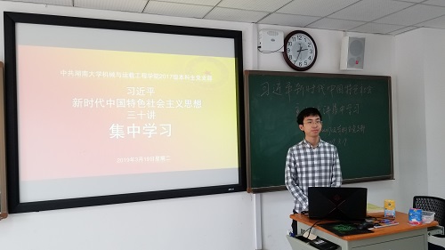 为贯彻《做好<习近平新时代中国特色社会主义思想三十讲>学习工作》文件要求,我院17级本科生党支部于2019年3月19日下午安排全体党员、预备党员,开展了学习研讨活动,此次活动由支部书记郑朝阳同志主持。