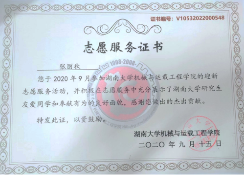 的迎新活动,积极帮助刚步入大学校园的师弟师妹们熟悉校园和宿舍园区,还参与了组织开学仪式及新生班会,并获得了优秀志愿者称号。
