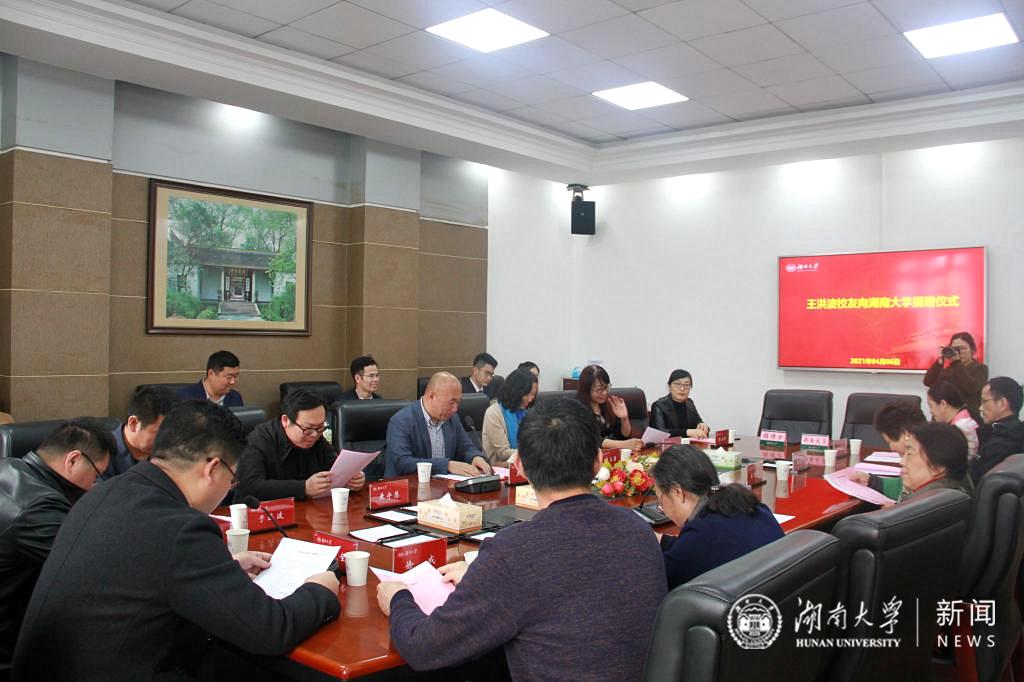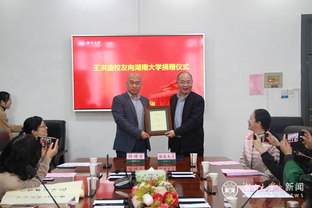 校友、哈尔滨校友会秘书长、哈尔滨东华科技有限公司董事长王洪波向母校捐赠一百万元,设立奖学金,奖励优秀湖大学子。校友总会副会长、教育基金会理事长张强,哈尔滨校友会秘书长滕文菊、大连校友会秘书长于远波等校友,长沙市第十五届人大代表、船山学社副社长黄守愚等参加活动。