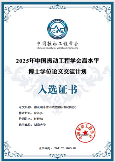 近日,我院金其多博士的博士学位论文《输流纳米管非线性耦合振动研究》(导师:任毅如教授)入选2025年中国振动工程学会高水平博士学位论文交流计划。