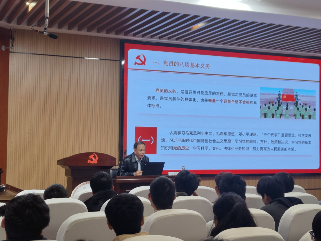 党委书记刘喜东为培训班学员讲授题为“牢记权利义务,争做先锋模范”的党课。刘喜东从认真履行党员义务、正确行使党员权利、辩证统一地认识党员的义务与权利三个方面展开讲授,并围绕党员应具备的基本条件进行了深入的剖析。他对全体学员寄予殷切期盼,鼓励同学们积极向党组织靠拢,切实端正入党动机,走好入党第一步。