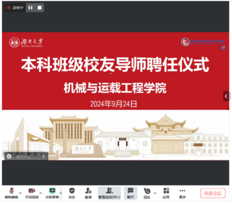 校友导师代表赵思翔发言回顾了过往在湖大求学的美好瞬间,并表示非常荣幸能够成为学院的校友导师,在今后定将不留余力帮助并指导同学们。张军坤祺作为学生代表发言,感谢学院及校友提供的平台和机会,并承诺必将珍惜机会,加强和校友导师间的联系沟通,努力成长为经世致用的领军人才。