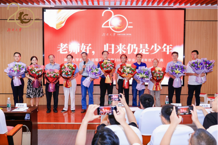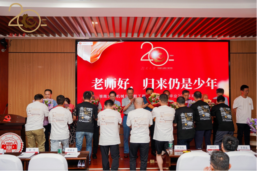随后,校友代表向与会老师们献上鲜花、祝福与感谢。教师代表方其让深情的表达了对04届校友的祝贺,他表示04届学子扎根在各行各业,取得了不小的成绩,为同学们的表现感到自豪与骄傲。黎志照老师鼓励校友在人生爬坡的上升期要坚守初心,勇敢拼搏,发扬湖大精神,用实力展示湖大人、机械人的风采。