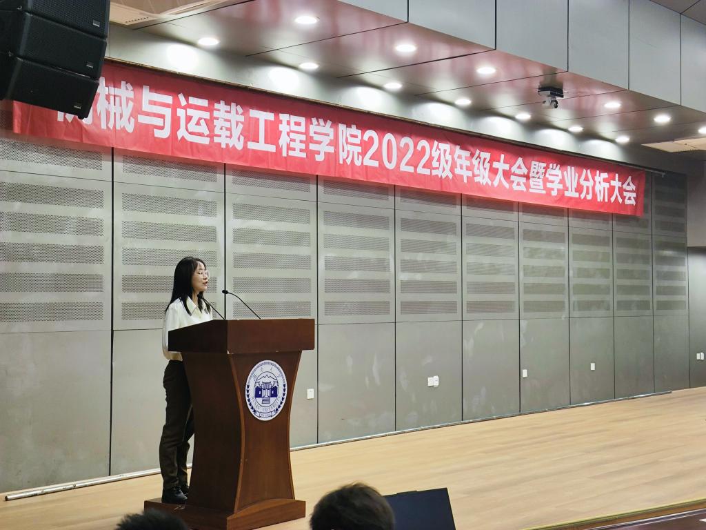 大会伊始,由年级会委员长李政达同学为同学们总结2022年级同学成绩的总体分析。通过各班级的挂科率提醒学业稍落后的同学继续努力,不断进步;同时也表彰了年级成绩最优秀的三个班级:机械2202班,机械2206班,力学2201班,希望同学们能够学习这三个班级的学风和学习氛围,大家共同进步。