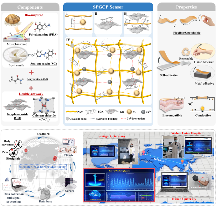 此外,该团队采用多重交联协同策略,开发了一种超拉伸、高灵敏度和自粘附的导电水凝胶。多重互穿网络结构及其强相互作用赋予水凝胶优异的拉伸性(断裂伸长率达10300%)、高灵敏度(GF达13.45)以及长期稳定的自粘附特性,且可以组装成可穿戴应变传感器实现人体微弱生理信号和关节大拉伸运动的高敏检测。开发的水凝胶传感器通过与云平台结合,实现了跨国远程监测。相关成果以“Bio-inspired, Super-stretchable and Self-adhesive Hybrid Hydrogel with SC-PDA/GO-Ca2+/PAM Framework for High Precision Wearable Sensor”为题发表在Chemical Engineering Journal(IF 16.7)上(//doi.org/10.1016/j.cej.2022.137259)。