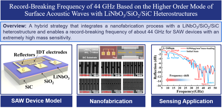 通过开发极限纳米加工工艺,在高声速LiNbO3/SiO2/SiC异质结构衬底材料上制作了波长为160 nm、线宽为35 nm的叉指换能器,实现了最高工作频率约为44 GHz的超高频SAW谐振器,刷新了目前SAW器件的工作频率纪录。同时,该研究还实验验证了44 GHz超高频下的微质量传感应用,获得的质量灵敏度高达33151.9 MHz·mm2·μg−1,约为传统低频SAW器件的4000倍。相关工作以“Record-breaking frequency of 44 GHz based on the higher order mode of surface acoustic waves with LiNbO3/SiO2/SiC heterostructures”为题发表在全球工程综合期刊排名第一的Engineering(IF 12.8)上(//doi.org/10.1016/j.eng.2022.05.003)。
