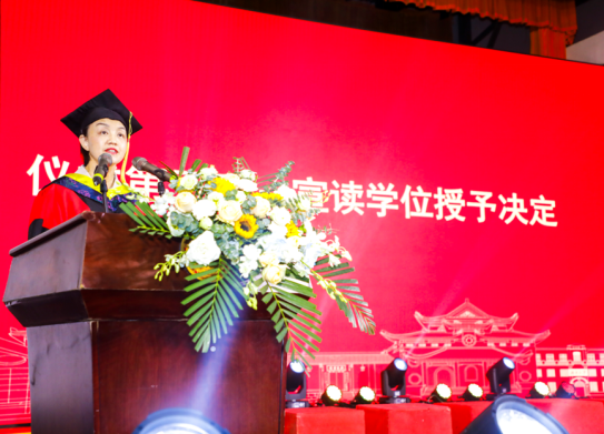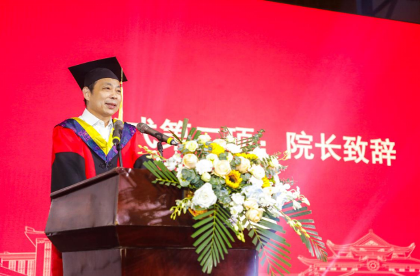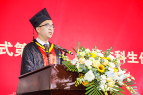 奏唱国歌后,丁荣军致辞,他祝贺同学们圆满地完成了学习任务,肯定了在校学习期间展现的聪明才智,坚信同学们都将在未来绽放光彩。同时他期望同学们未来人生中不管是取得成功还是遇到困难,都能告诉你们的老师,成功时,让老师们分享你的喜悦,遇到困难时,老师们都能尽力帮你排忧解难。同学们无论选择继续深造还是任职工作,都能骄傲地说出“我是湖大机械人!”