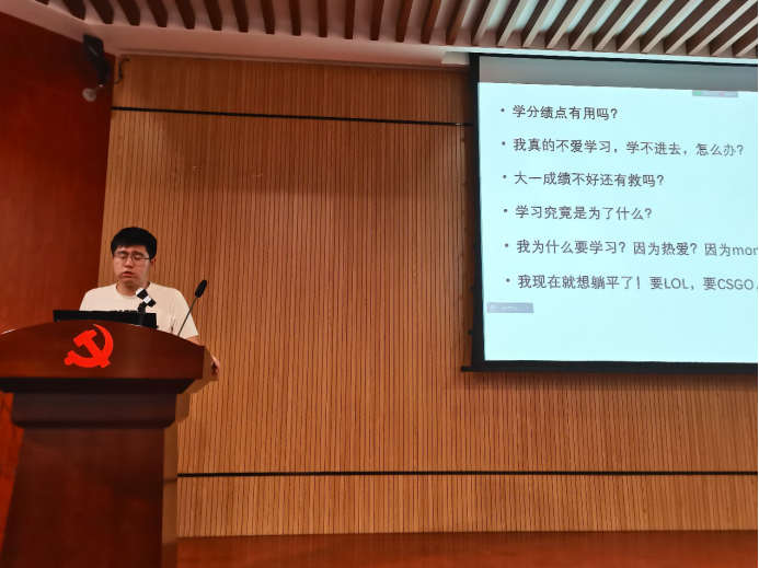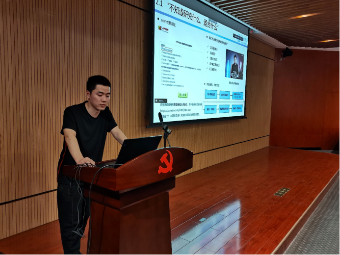 徐天遨为同学们仔细辨析了保研与留学的困惑和选择,并围绕留学进行了较为详细的讲解,与大家交流了留学的时间节点和注意事项,他呼吁同学们要有大的格局,要放眼世界,为祖国奉献自己的力量,会场一度掌声不断。接下来,赵容鼎同学通过自身的例子告诉同学们:即使大一成绩不佳,但也可以用努力和毅力去创造奇迹,最终实现自己的目标。而后他又和大家探讨了未来发展的规划选择,从留学、保研、考研、就业等方面为同学们提供了建议。