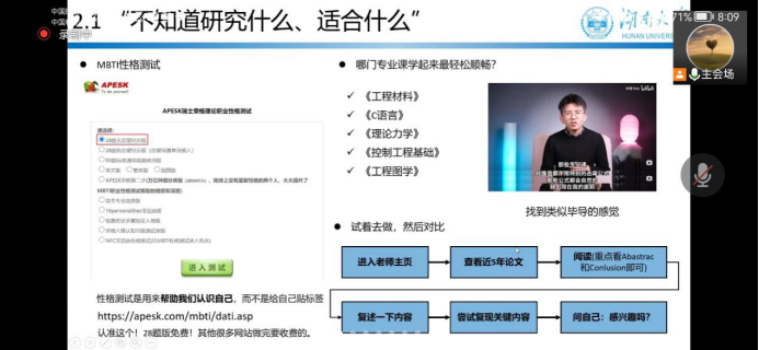 张政昊同学针对当前许多大三的同学所面临的保研流程和简历制作的困惑,用自己的经历和经验,为同学们讲解了如何改善简历、如何找到自己的闪光点、如何去选择自己的研究方向。赵佳盈同学压轴出场,为同学们讲述了转专业同学的保研历程,指出保研的细节和重点时间节点,并为大家答疑解惑。