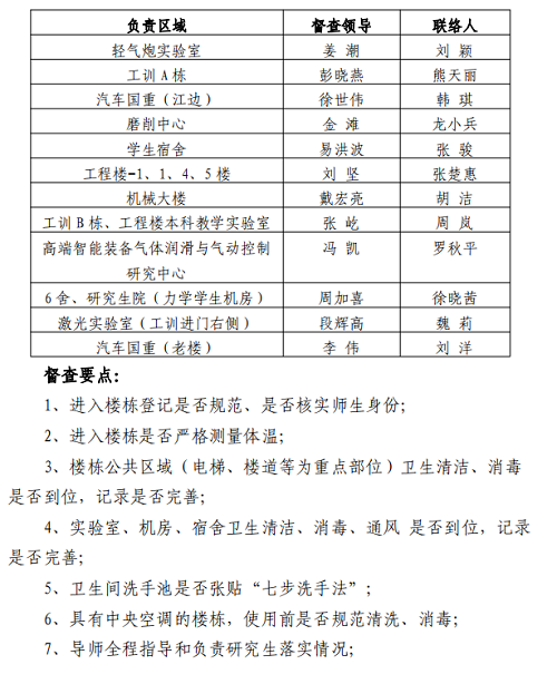 检查组先后检查了汽车车身先进设计制造国家重点实验室、运载装备智能网联系统创新中心、机械工程国家级实验教学示范中心等,了解疫情期间各楼栋、实验室的管理和开放情况,督查疫情防控要求落实情况,就疫情防控、实验室安全管理等重点工作与相关负责人做了特别强调。