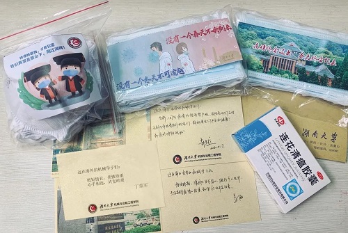 与研究生会共同筹备的防疫爱心包,正在漂洋过海的送达湖大海外学子的手中。每个包裹中包含10个N95口罩,20个医用防护口罩,1盒连花清瘟胶囊,还有来自学院的寄语祝福卡片,这些将会送达美国、英国、澳大利亚、新加坡、日本、韩国、加拿大、法国、波兰、比利时的26名留学生手中。