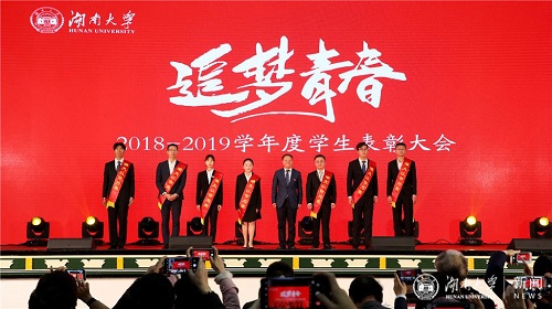 12月17日晚,2018-2019学年度学生表彰大会在大礼堂举行。校长段献忠发表讲话,并为先进个人和先进集体代表颁奖、佩戴“湖大以你为荣”绶带。“倪正东奖学金”设奖者、jojo漫画