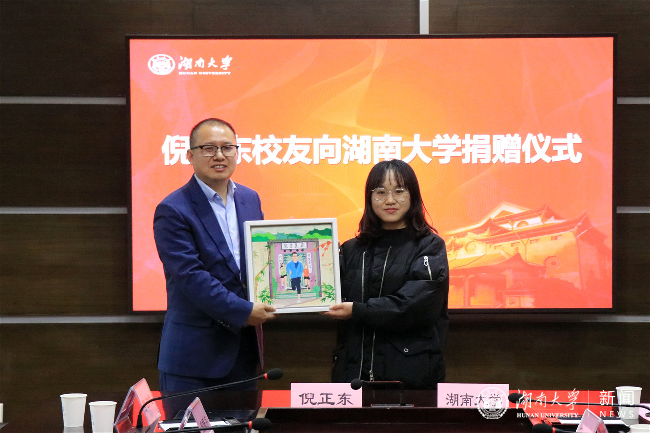 捐赠仪式上,倪正东与教育基金会理事长张强教授签订捐赠协议。获奖学生代表向倪正东赠送自创漫画。