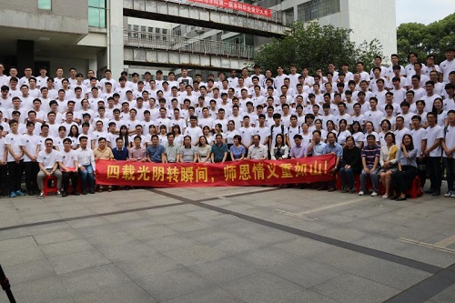 随后由15级钟文琛同学领读,全体学生朗诵谢师词:四载光阴转瞬间,师恩情谊重如山,桃李芬芳满天下,恩情浩瀚似海深! 短短四句话包含的是同学们对恩师辛勤付出的感激之情,是对三尺讲堂上兢兢业业传授知识的教师们最高的赞誉。第三项全体师生合唱校歌。四百余人齐声唱响校歌,每个人都将初入校园时的激动与颤栗的心情用响亮的歌声表达了出来。第四项全体师生合照,同学们纯真的笑颜与老师们端庄的姿态随着快门声被永久固定在了相片中,作为大学四年光阴的最好纪念。
