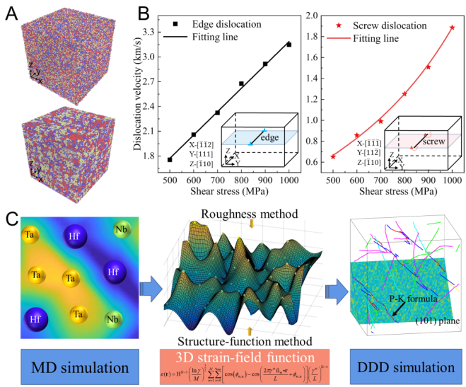 基于非均匀晶格应变随机场理论,开发了多元合金通用无拟合参数的介观尺度离散位错动力学模拟方法,可用于探索任意元素组成和原子构型的多元合金介观尺度变形和强化机制(图1)。基于透射电子显微镜实验表征,刃位错首次被引入体心立方多主元合金的位错动力学模拟,揭示了螺/刃位错双向转变是通过位错扭结/割阶机制产生。