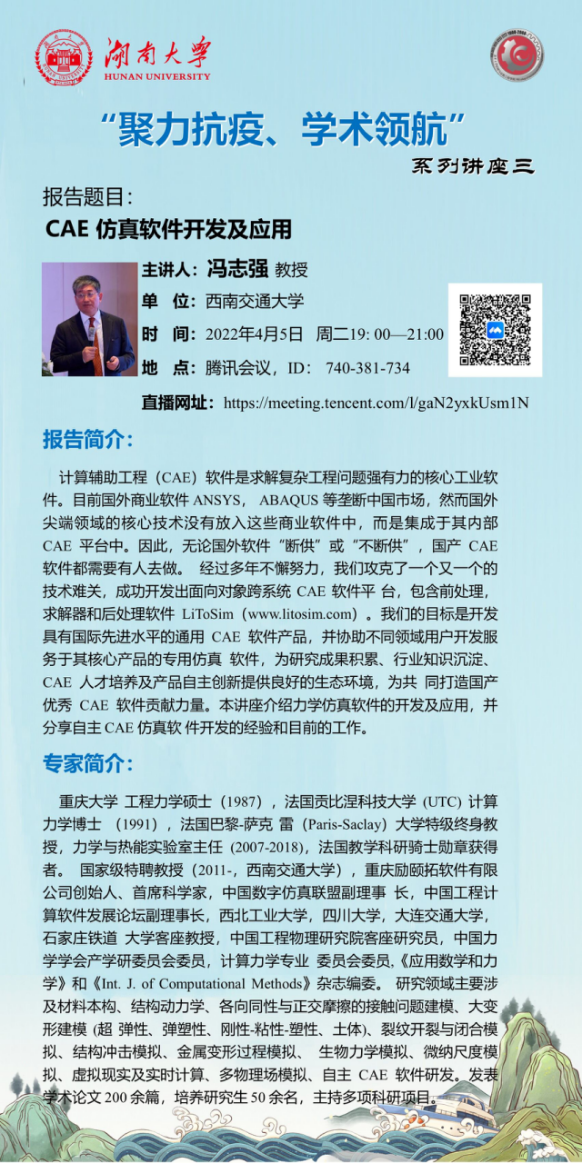 计算辅助工程(CAE)软件是求解复杂工程问题强有力的核心工业软件。目前国外商业软件ANSYS,ABAQUS等垄断中国市场,然而国外尖端领域的核心技术没有放入这些商业软件中,而是集成于其内部CAE平台中。因此,无论国外软件“断供”或“不断供”,国产CAE软件都需要有人去做。经过多年不懈努力,我们攻克了一个又一个的技术难关,成功开发出面向对象跨系统CAE软件平台,包含前处理,求解器和后处理软件LiToSim(www.litosim.com)。我们的目标是开发具有国际先进水平的通用CAE软件产品,并协助不同领域用户开发服务于其核心产品的专用仿真软件,为研究成果积累、行业知识沉淀、CAE人才培养及产品自主创新提供良好的生态环境,为共同打造国产优秀CAE软件贡献力量。本讲座介绍力学仿真软件的开发及应用,并分享自主CAE仿真软件开发的经验和目前的工作。