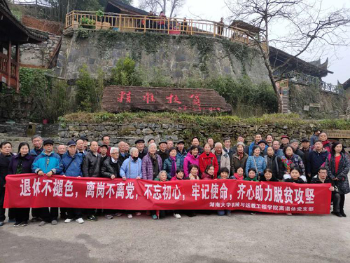 为深入贯彻落实习近平总书记关于脱贫攻坚工作的重要指示精神,11月25日,我院离退休党支部开展“退休不褪色,离岗不离党,不忘初心,牢记使命,齐心助力脱贫攻坚”主题党日活动。此次由离退休支部书记李孟仁书记及五位支委带队,学工办老师郑朝阳老师、闫智琪老师随行,共55位老师赴花垣县十八洞村参加活动。通过参观学习,广大党员深受教育,充分认识和领会习近平总书记精准扶贫精神。